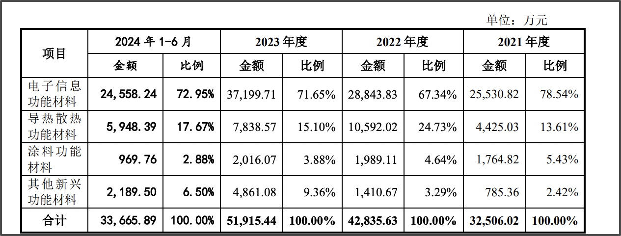 電子信息功能材料為錦藝新材核心營收來源,截至2024上半年,該業(yè)務(wù)營收占比超 70%。而上述募投項(xiàng)目正是對公司核心業(yè)務(wù)的產(chǎn)能擴(kuò)張。