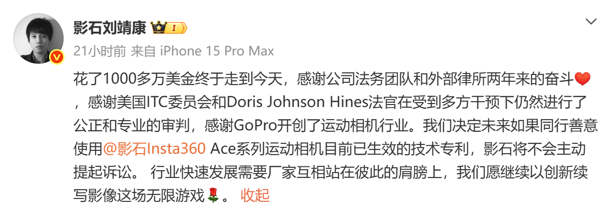劉靖康表示花了1000多萬美金終于走到今天,感謝了法務(wù)團(tuán)隊(duì)的奮斗與法官在多方干預(yù)下的公正審判,并大氣感謝GoPro開創(chuàng)了運(yùn)動(dòng)相機(jī)行業(yè)。
