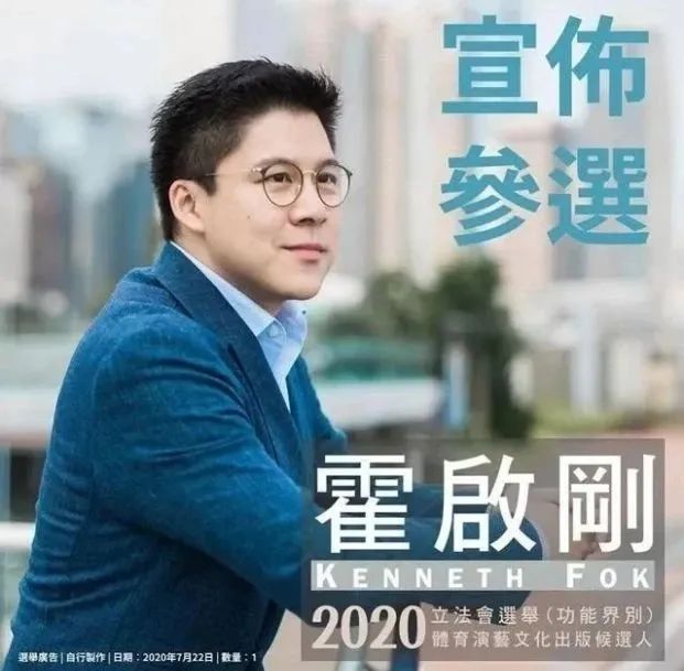 2020年7月22日晚,霍啟剛在臉書發(fā)文,正式宣布在體育、演藝、文化及出版界參選,并在7月23日報名。霍啟剛表示,希望可以利用立法會平臺,善用多年累積的經(jīng)驗(yàn)、人脈、資源,為業(yè)界服務(wù)。
