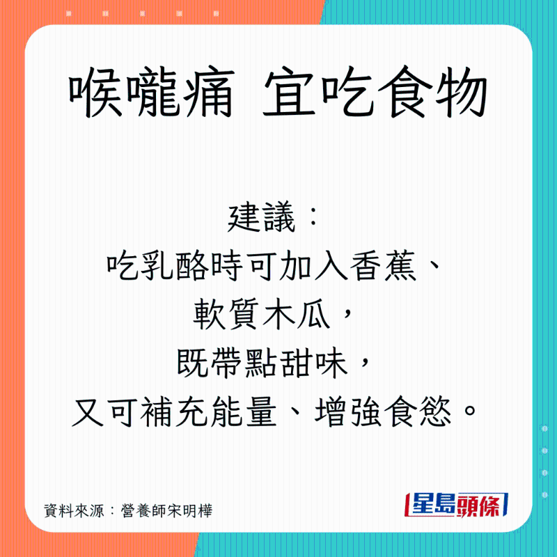 營養(yǎng)師宋明樺指,喉嚨痛時要避免3類食物,以免癥狀加劇,減慢復(fù)原時間。另她建議吃2類食物,以補充熱量,加快復(fù)原。