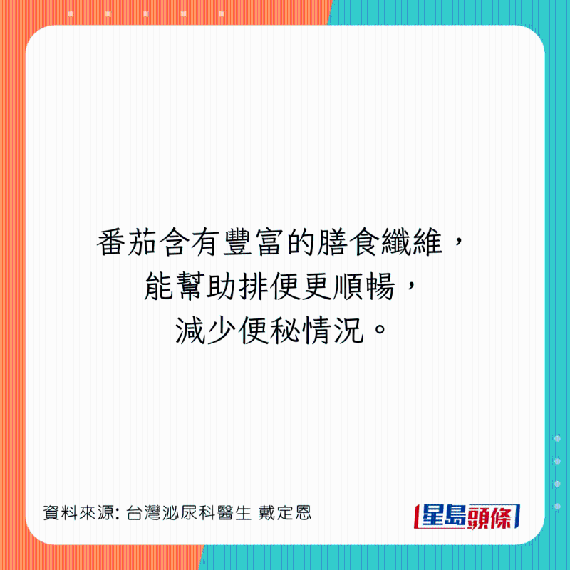 番茄含有豐富的膳食纖維,有助更順暢排便,減少便秘情況。