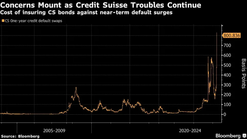 CMAQ的報(bào)價(jià)顯示,針對(duì)瑞信債券的一年期信用違約互換(CDS)在周二業(yè)務(wù)結(jié)束時(shí)的指示性報(bào)價(jià)為835.9個(gè)基點(diǎn),且其他報(bào)價(jià)來(lái)源顯示該CDS價(jià)格在周三進(jìn)一步上漲并逼近1000個(gè)基點(diǎn)(CDS價(jià)格越高說(shuō)明違約概率越大)。這一增幅至少自2003年以來(lái)從未出現(xiàn)過(guò),是20年平均水平的14倍以上,令大金融危機(jī)期間的水平相形見絀。而且瑞信一年期CDS目前的價(jià)格水平約為競(jìng)爭(zhēng)對(duì)手瑞銀的18倍、德意志銀行的9倍。