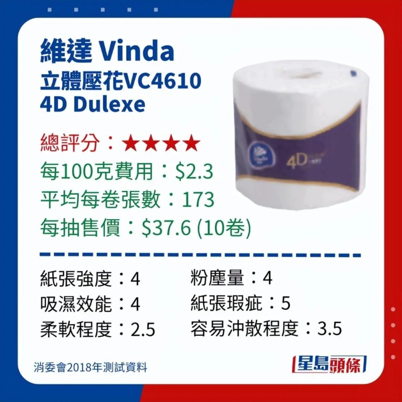 “維達(dá) Vinda Smart Bathroom Tissue VC4466”及“唯潔雅 Virjoy Super Long SKU:Y213VWIF3”亦僅得2分,不是最佳選擇。