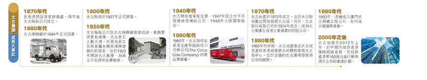 太古于1870年在香港開設(shè)首家辦事處,從此植根香港。150多年來,集團與香港一同成長,以長遠發(fā)展為目標,開創(chuàng)多項業(yè)務(wù),助力香港發(fā)展成為環(huán)球商業(yè)樞紐。時至今日集團已發(fā)展為一個多元化的跨國企業(yè),核心業(yè)務(wù)涵蓋地產(chǎn)、飲料及航空,與香港人的生活息息相關(guān)。