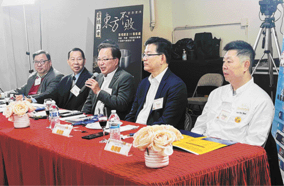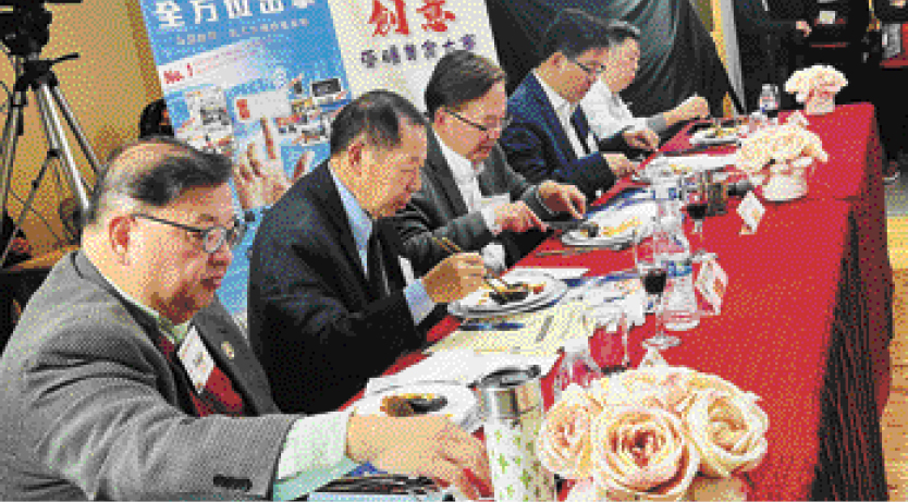 大賽評(píng)判(左起)舊金山華埠商戶聯(lián)會(huì)會(huì)長邵旗謙、中藥針灸中醫(yī)師曾灝林、美國中藥聯(lián)商會(huì)會(huì)長劉源凱、星島日?qǐng)?bào)美西版社長梁建鋒、半島飲食集團(tuán)出口部總監(jiān)詹慶輝。