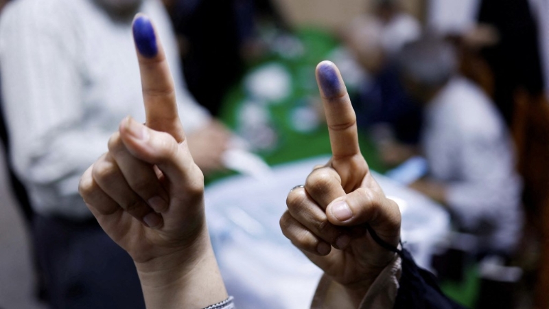 ▲伊朗選民展示沾上墨水的手指,證明已投票。(路透社)