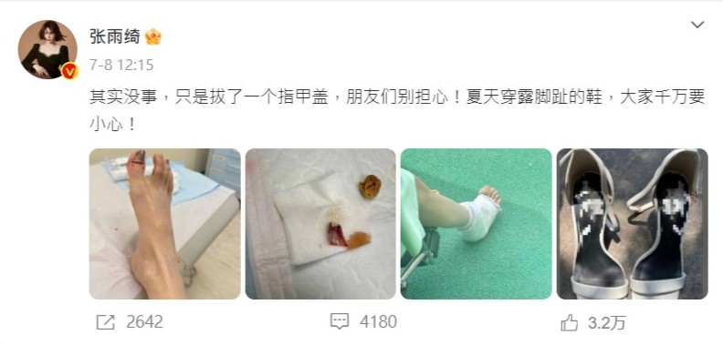 張雨綺日前在微博上載坐輪椅的照片,見(jiàn)到她的右腳拇指上有明顯的損傷,張雨綺透露穿涼鞋時(shí)不慎傷到腳趾,要將腳甲拔除。張雨綺貼出受傷及腳甲的照片留言:“其實(shí)沒(méi)事,只是拔了一個(gè)指甲蓋,朋友們別擔(dān)心!夏天穿露腳趾的鞋,大家千萬(wàn)要小心!”
