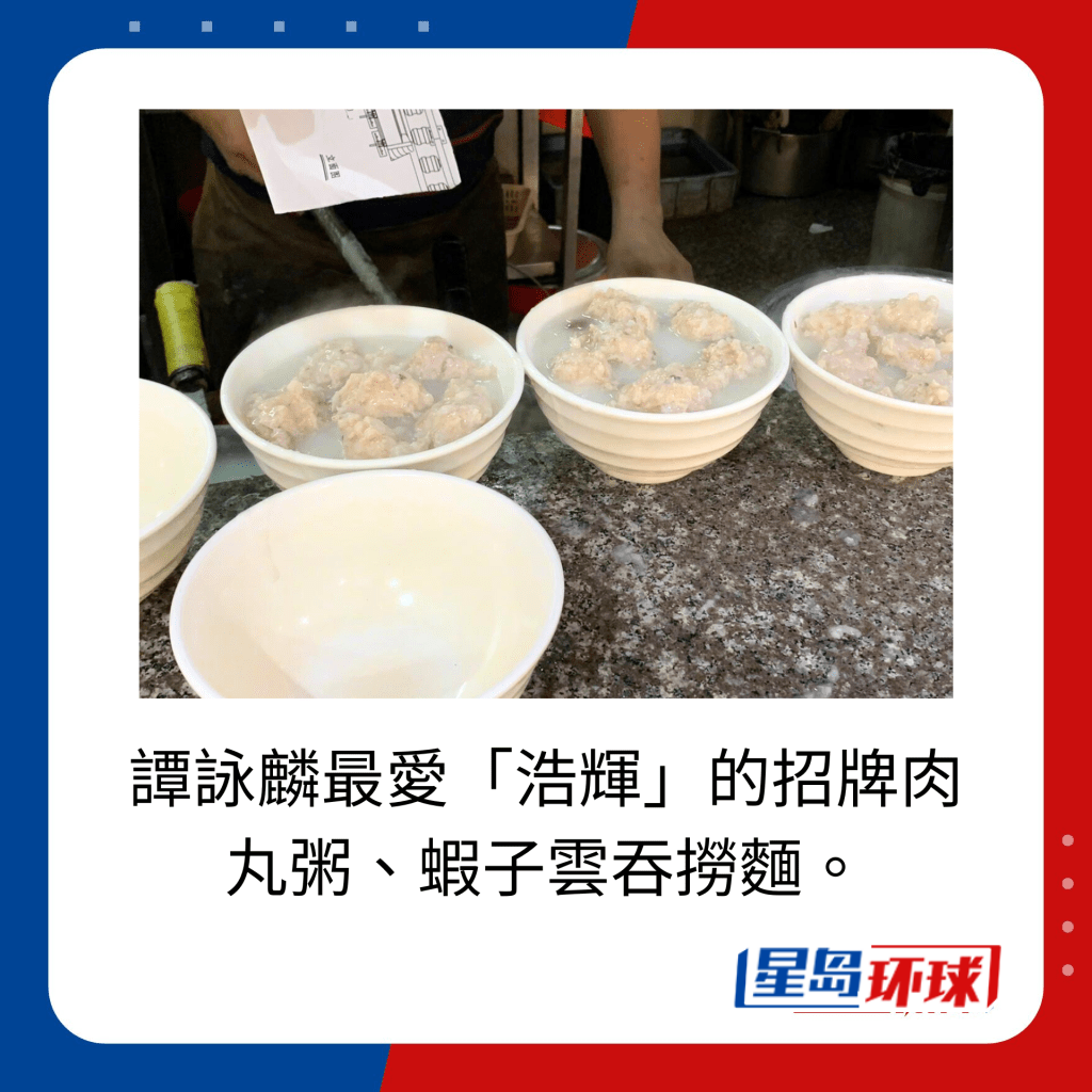 譚詠麟過去曾在微博介紹一間叫“浩輝”的粥店,大推店鋪的肉丸及弟粥和蝦子云吞撈面。黎耀祥則是食牛腩面、肉丸粥、韭菜豬紅等等,叫滿一大桌。原來食店是當(dāng)?shù)責(zé)衢T餐廳,經(jīng)營(yíng)近80年,已經(jīng)傳足三代,招牌的肉丸粥更是遠(yuǎn)近馳名,食客都大贊手打肉丸扎實(shí)飽滿,而且里面還加入冬菇等食材,增加口感。食店價(jià)格也非常相宜,招牌肉丸粥或肉丸及弟粥只需16元人民幣(約17.2港元),譚詠麟推薦的蝦子云吞撈面只需17人民幣(約18.2港元),其他菜式絕大部份亦只是30元以下,CP值甚高。不過店鋪在早上6時(shí)開業(yè),下午3時(shí)就關(guān)門,如果要品嘗譚詠麟推薦的肉丸粥,最好在早餐時(shí)段前往。