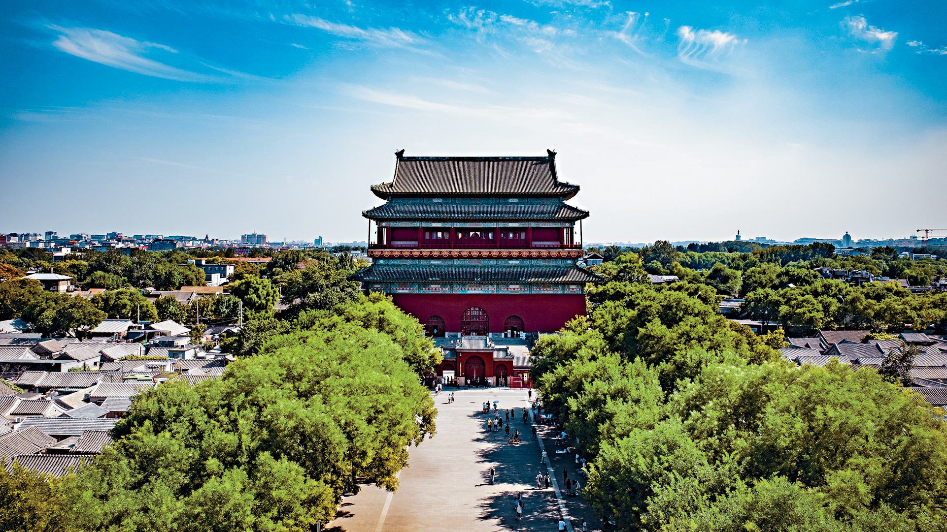 ▲從景山最高處的萬(wàn)春亭向北眺望,可看到北京中軸線上氣勢(shì)恢宏的鐘鼓樓。