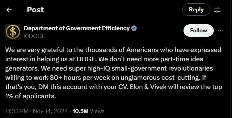 “我們非常感謝成千上萬美國人表示有興趣幫助我們的‘政府效率部’(DOGE)。我們不需要更多兼職的創(chuàng)意創(chuàng)造者,而是需要超高智商的小政府改革者,并愿意每周工作80小時(shí)以上,專注于枯燥的成本削減工作。”這則招聘啟事寫道,“如果你是這樣的人,請(qǐng)將簡(jiǎn)歷直接發(fā)送給本賬號(hào)。埃隆和維韋克將對(duì)前 1%的申請(qǐng)者進(jìn)行審核?!?/p>