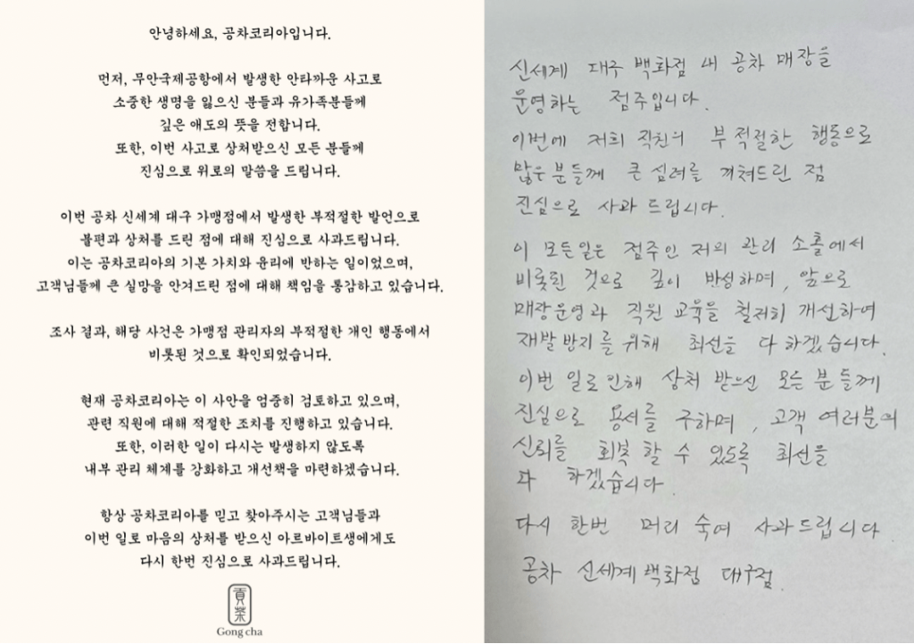 韓國貢茶周一(30日)急忙在官網(wǎng)發(fā)出公司聲明,更附上加盟店主管的手寫信致歉。