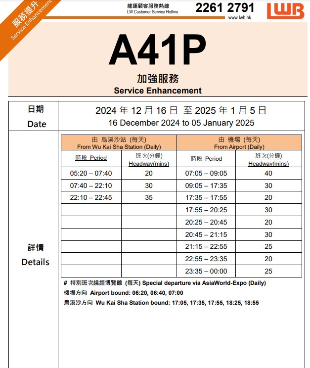 另外,由即日起至2025年2月3日,城巴加強NA路線服務(wù),包括NA21港珠澳大橋香港口岸/機場往返旺角、NA10鴨脷洲往返機場/港珠澳大橋香港口岸、NA12杏花邨往返機場/港珠澳大橋香港口岸 、NA29將軍澳(寶琳)往返機場/港珠澳大橋香港口岸及各日間路線加強清晨時段班次,便利市民有市區(qū)前往機場。