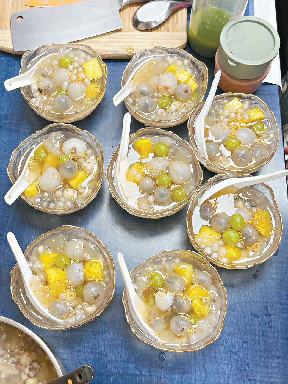 左起:雅典娜劉跟劉源康品嘗“水晶香露.晶簾藏珠”