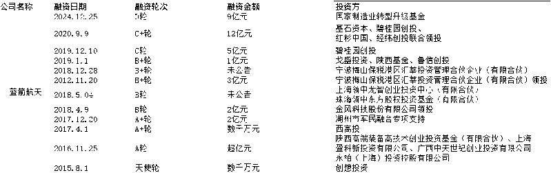 2015年,藍箭航天憑一紙PPT撬動天使輪融資,到2024年底已累計完成12輪融資,先后引入紅杉中國、經緯中國、碧桂園創(chuàng)投等一線機構,2024年藍箭航天單筆獲國家制造業(yè)轉型升級基金9億元注資,創(chuàng)下行業(yè)單筆融資紀錄,整體累計融資已超過70億元。