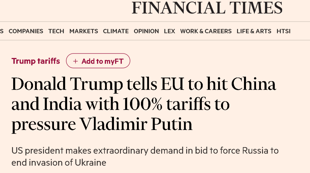 據(jù)英國《金融時報》和路透社披露,當(dāng)?shù)貢r間周二,在美國與歐盟的高級官員在華盛頓舉行的一場意在通過極限施壓俄羅斯結(jié)束俄烏沖突的會議上,美國總統(tǒng)特朗普提出了一個超乎尋常的要求:他想讓歐盟對購買俄羅斯能源的印度和中國這兩個大國都加征100%的關(guān)稅,以施壓俄羅斯盡快結(jié)束俄烏沖突。