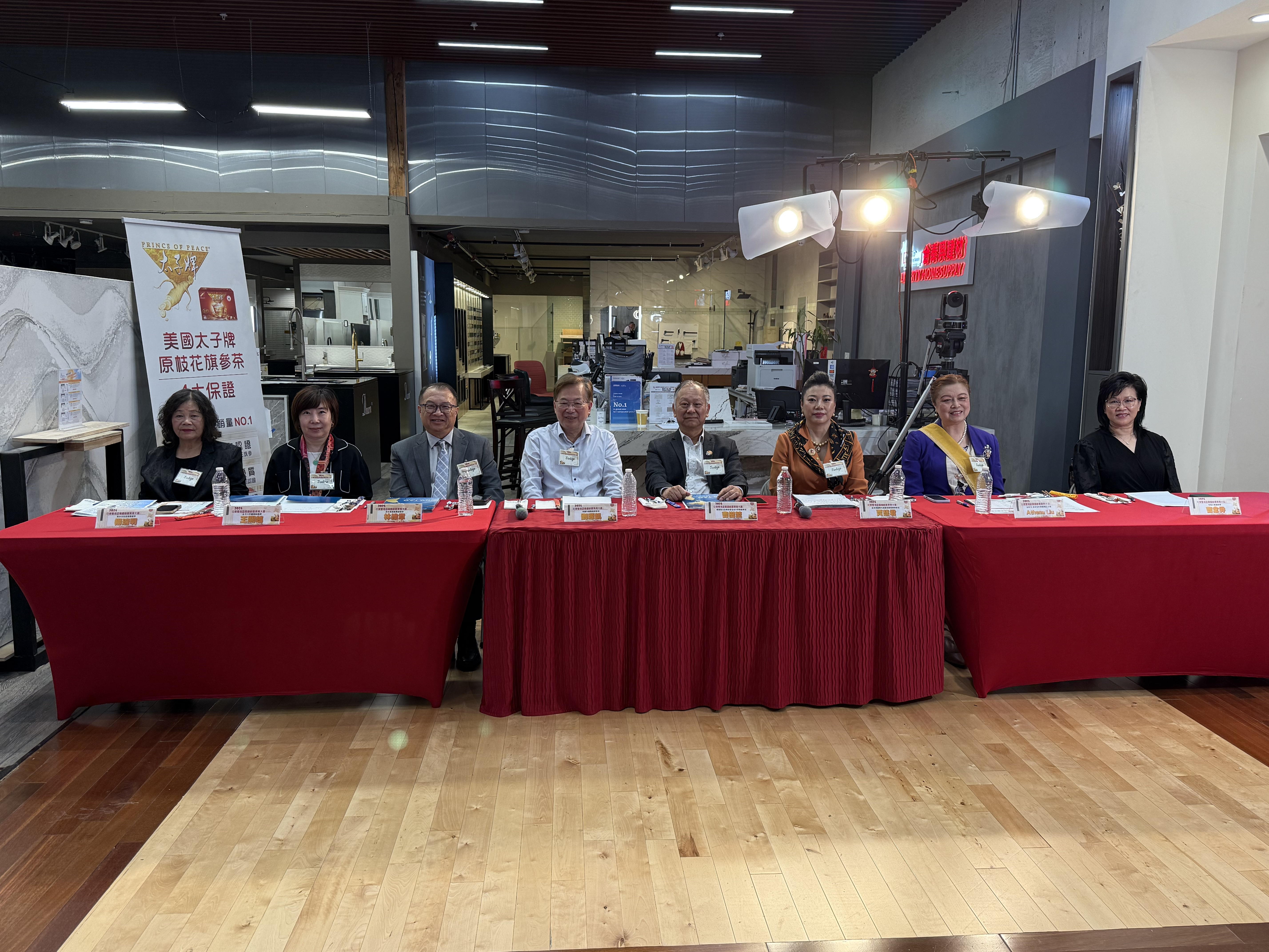▲比賽評(píng)委(右起)星島日?qǐng)?bào)總經(jīng)理曹念秀、SAPA美中友好聯(lián)盟執(zhí)行主席Athena Liu、北美洲國(guó)際名媛慈善聯(lián)盟創(chuàng)會(huì)會(huì)長(zhǎng)賈慧君、曹樹(shù)堃文化傳承基金永久榮譽(yù)董事長(zhǎng)曹樹(shù)堃、美國(guó)中藥聯(lián)商會(huì)會(huì)長(zhǎng)劉源凱、許氏參業(yè)集團(tuán)總經(jīng)理林維章、太子行中國(guó)地區(qū)總裁王闗越、美中文化促進(jìn)會(huì)董事楊瑞明。