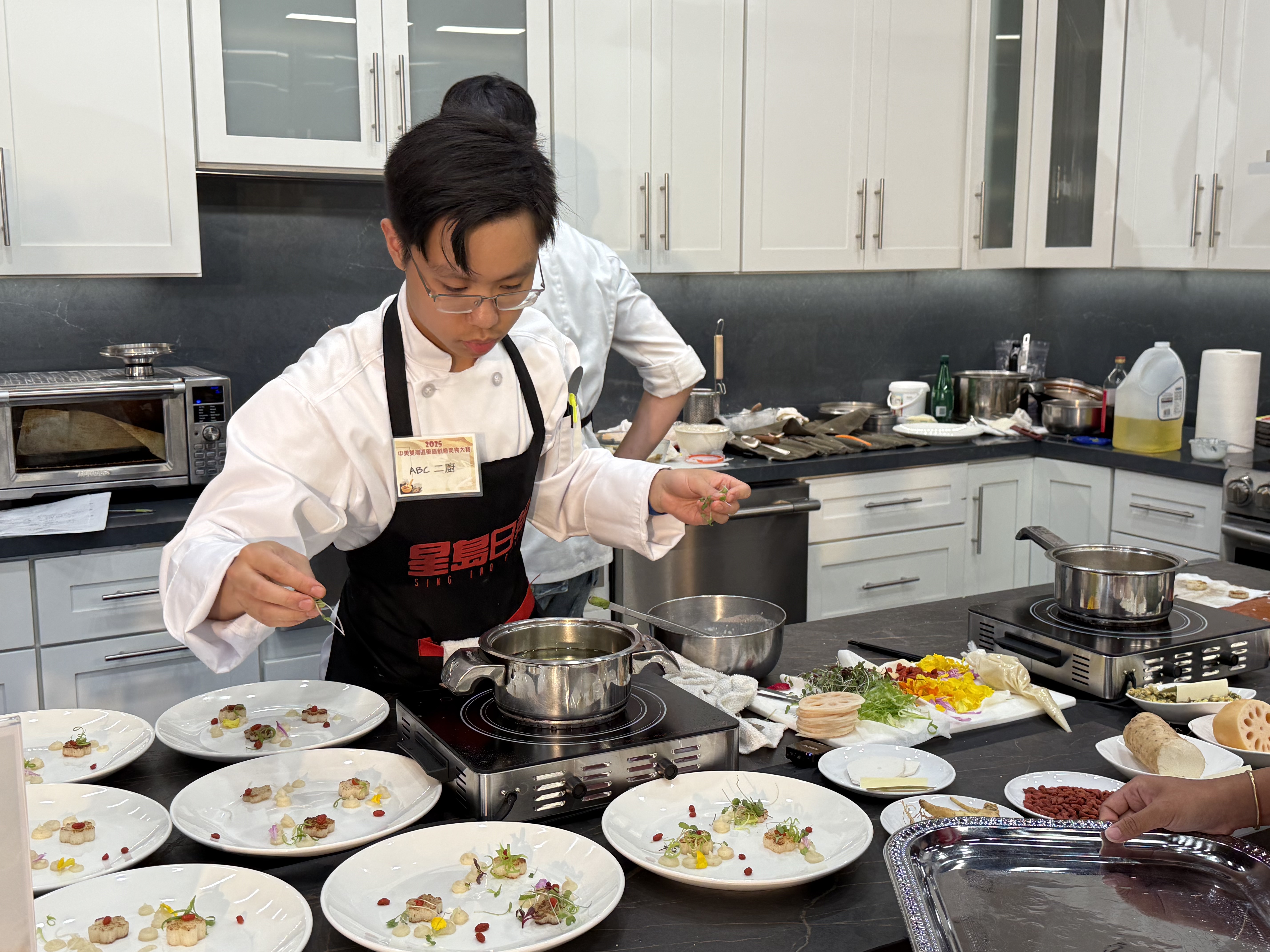 參加初賽的13支隊(duì)伍分成六組,用指定藥膳食材在指定時(shí)間內(nèi)完成作品。第一組參賽隊(duì)伍ABC二廚的作品為“秋鱈飄香,百合金鱗”。兩位參賽者皆任職于灣區(qū)米其林餐廳,曾于去年的藥膳比賽中獲得第三名。此次以茯苓、菊花、黃芪、花旗參、枸杞及南瓜等藥材入饌,烹制鱈魚(yú)。同組的美國(guó)加州五系中醫(yī)藥大學(xué)代表隊(duì)則推出糕點(diǎn)與飲品組合“迎秋”,以菊花、玫瑰花與南杏為主材,滋味清甜,潤(rùn)肺養(yǎng)心。