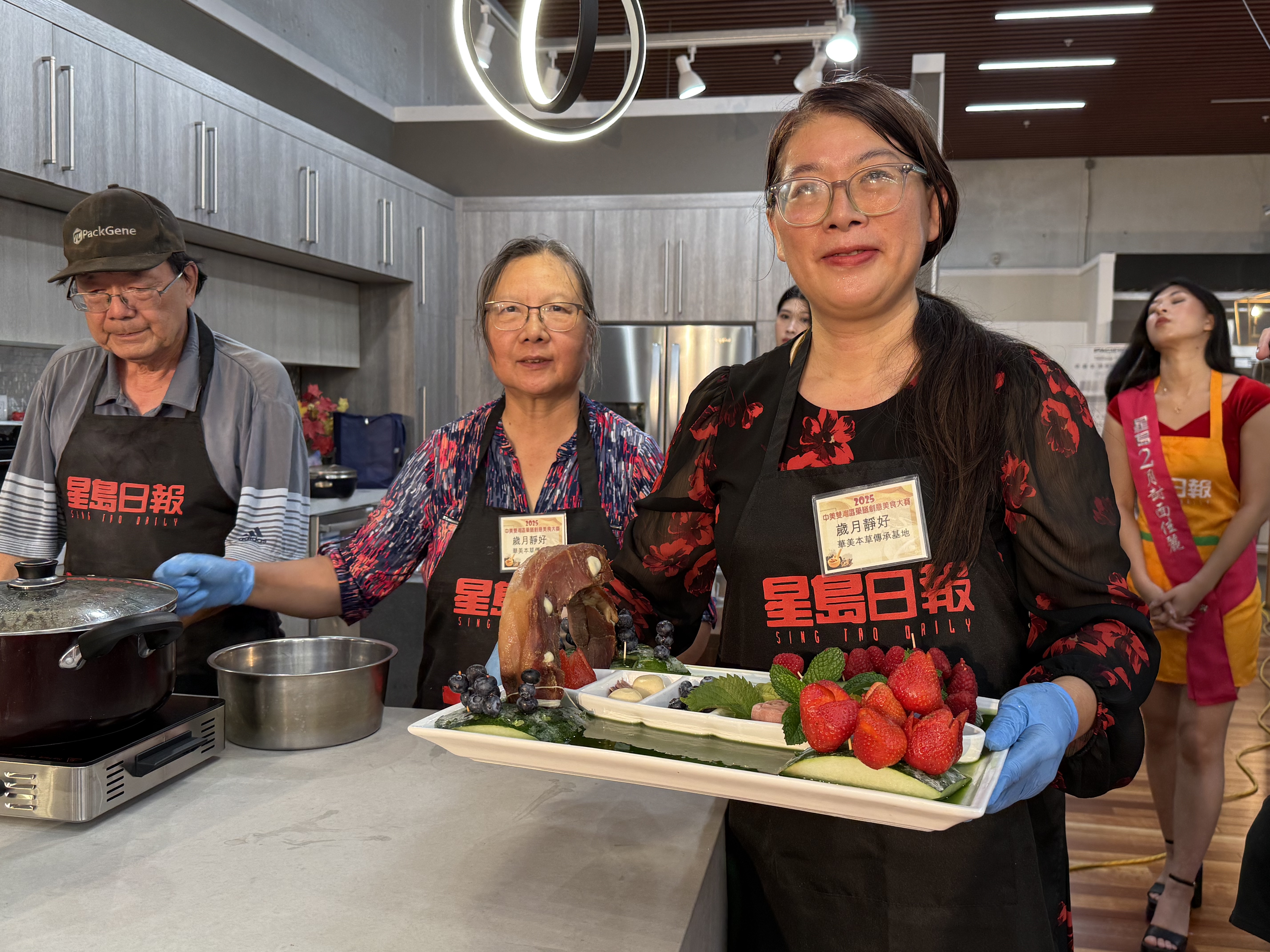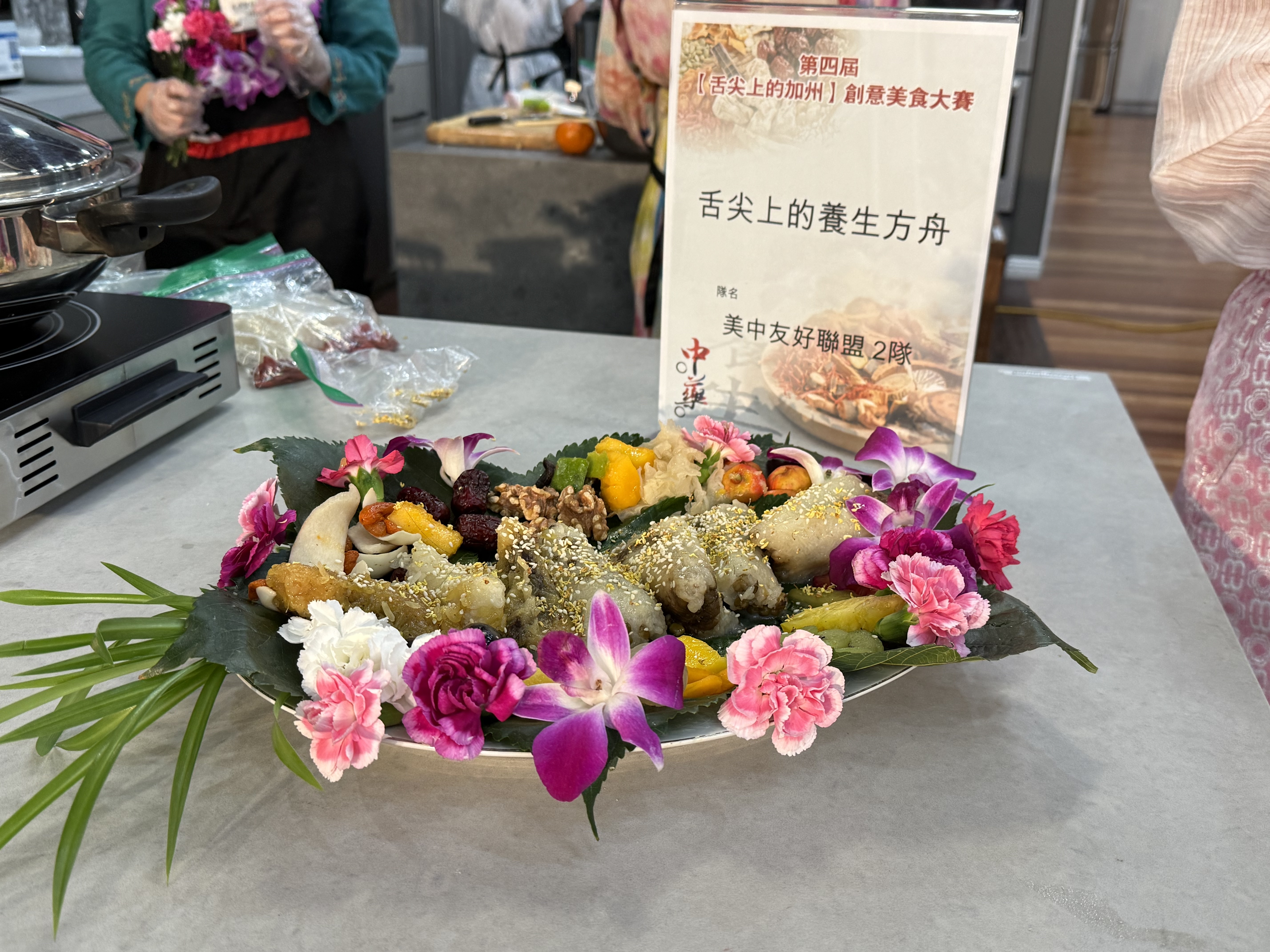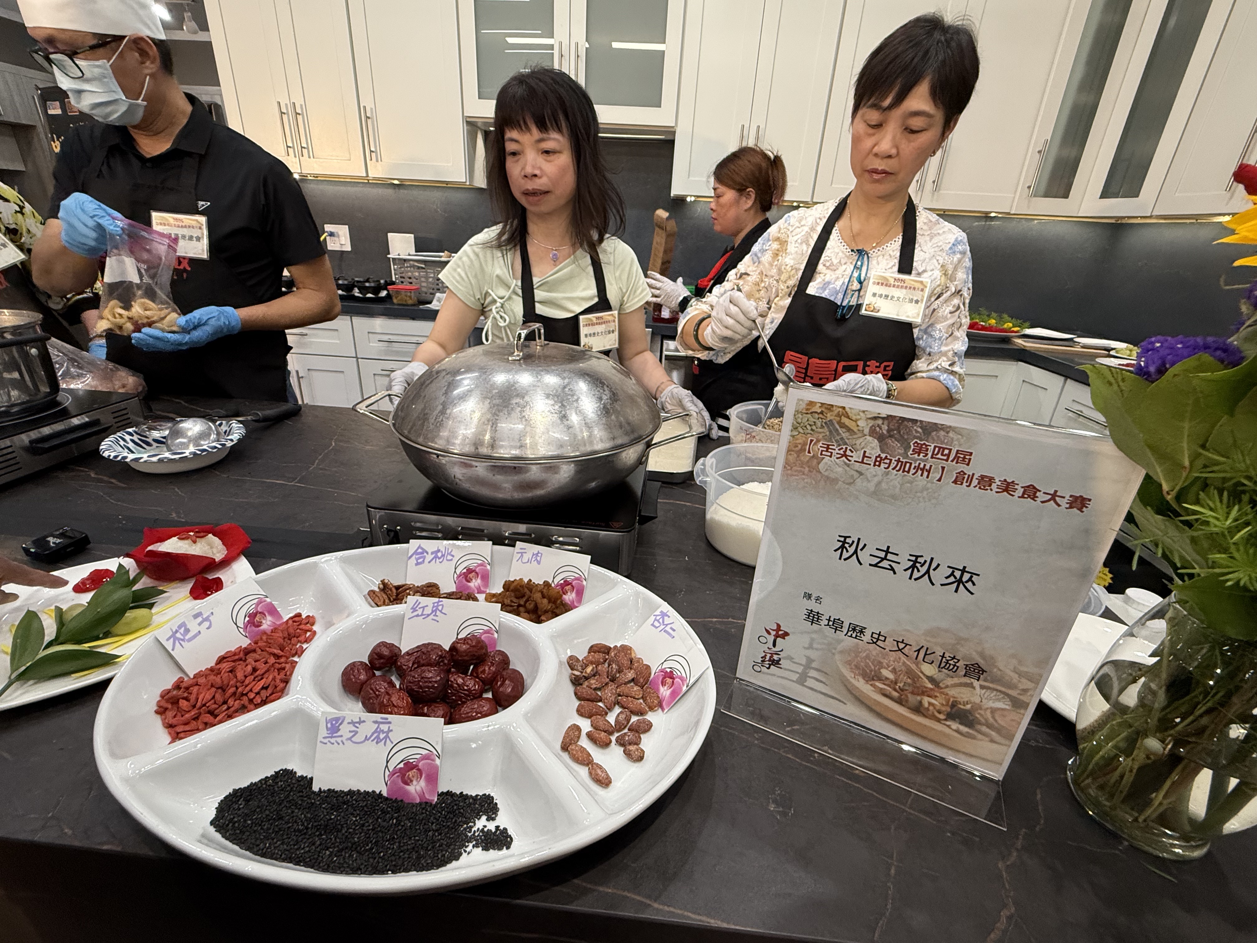第六組共三組作品各有特長(zhǎng)。舊金山鼎峰娛樂(lè)飲食集團(tuán)帶來(lái)“香煎藥膳鴨脯”,以八角、桂皮、陳皮、沙姜等作料,最后佐以黑松露,評(píng)委稱中西合璧。美國(guó)華商總會(huì)的“滋補(bǔ)椰青藥膳雞煲”以黃毛雞配冬菇、紅棗、山藥等藥材,椰青清香,湯鮮不膩。華埠歷史文化協(xié)會(huì)的“秋去秋來(lái)”以杞子、核桃、杏仁、紅棗等制作糯米糍。