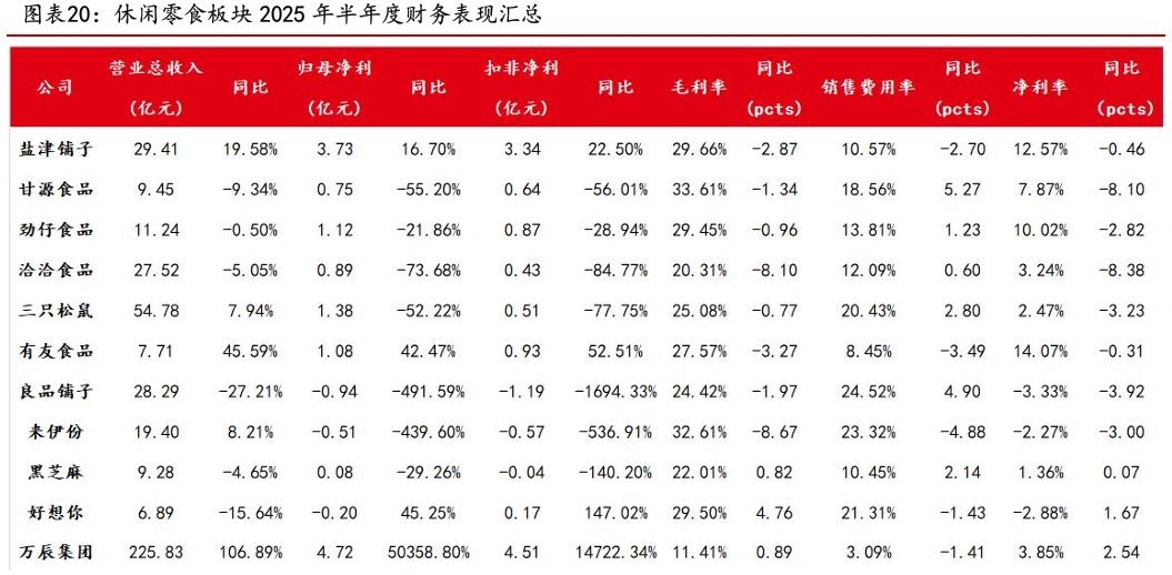 而傳統(tǒng)零食連鎖品牌則節(jié)節(jié)敗退。良品鋪?zhàn)樱?03719.SH)、來伊份(603777.SH)的營業(yè)收入及歸母凈利潤均出現(xiàn)下滑,即便是維持正增長的三只松鼠(300783.SZ),也僅處于百億營收水平。