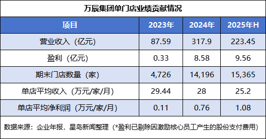 不過,萬辰集團(tuán)單店收入出現(xiàn)下滑趨勢,從2023年約29.44萬元/家/月降至2025年上半年的25.2萬元/家/月。