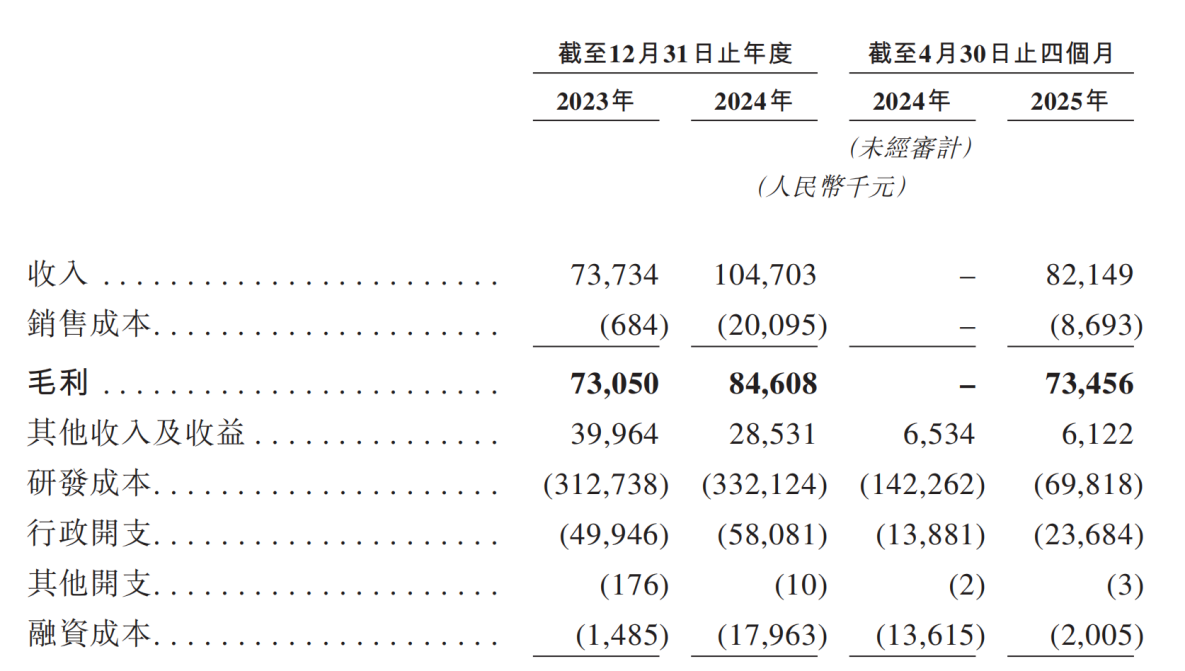 2023-2024年,勁方醫(yī)藥的收入分別約為0.74億元和1.05億元,凈利潤分別約為-5.08億元、-6.78億元。2025年前4個(gè)月,該公司的營收及利潤則分別約為0.82億元、-0.67億元,其中來自授權(quán)的收入約為0.78億元,占比超95%。
