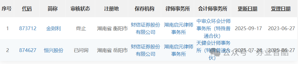 9月17日,北交所批量更新審核動(dòng)態(tài)。由財(cái)信證券保薦的衡陽市金則利特種合金股份有限公司(簡稱:金則利),審核狀態(tài)態(tài)顯示為“終止”。至此,財(cái)信證券在滬深北三家交易所的IPO項(xiàng)目,僅剩恒興股份一單“獨(dú)苗”。