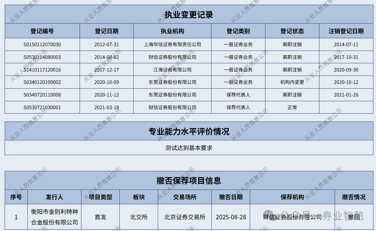 楊小玲女士,本科學(xué)歷,注冊(cè)會(huì)計(jì)師。她自2012年起投身投行業(yè)務(wù),曾輾轉(zhuǎn)財(cái)富里昂證券(后更名華信證券,已摘牌)、財(cái)信證券、江海證券、東莞證券,參與過卓越投資可交債、裕人投資可交債、賽為智能可轉(zhuǎn)債等項(xiàng)目。2021年3月,她加入財(cái)信證券股權(quán)融資部后,參與了航天環(huán)宇科創(chuàng)板IPO項(xiàng)目,并負(fù)責(zé)金則利新三板掛牌及定向發(fā)行。由于金則利是她在財(cái)信證券簽署的唯一一單IPO項(xiàng)目,此次撤單導(dǎo)致其“撤否率100%”。
