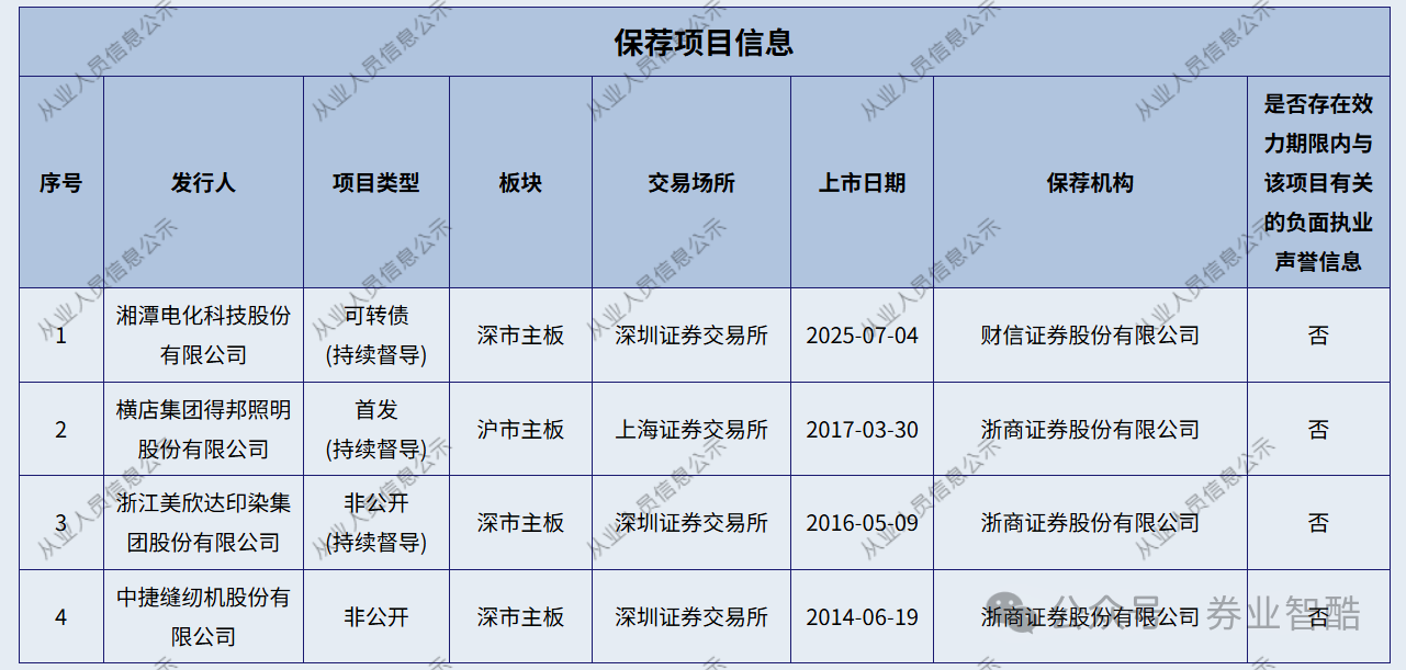 此前在浙商證券,王鋒曾簽署三單項(xiàng)目。而金則利是他在財(cái)信證券簽署的唯一一單IPO項(xiàng)目,此次撤單同樣導(dǎo)致其“撤否率100%”。今年8月,王鋒接替鄭志強(qiáng)先生擔(dān)任湘潭電化可轉(zhuǎn)債項(xiàng)目持續(xù)督導(dǎo)保薦代表人。