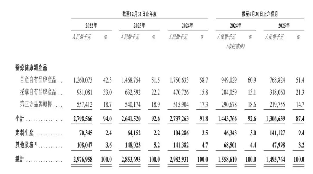 按生產(chǎn)類別劃分的話,自產(chǎn)自有品牌產(chǎn)品為可孚醫(yī)療最核心的收入來源,各期業(yè)務(wù)收入占比分別為42.3%、51.5%、58.7%及51.45%。
