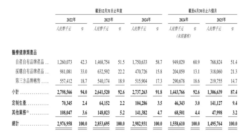 2022年-2025年上半年,可孚醫(yī)療的收入分別為29.77億元、28.54億元、29.83億元、14.96億元。2022年及2023年,可孚醫(yī)療最主要的收入來源為醫(yī)療護(hù)理類產(chǎn)品,業(yè)務(wù)收入占比期內(nèi)總收入的36.8%、25.7%。