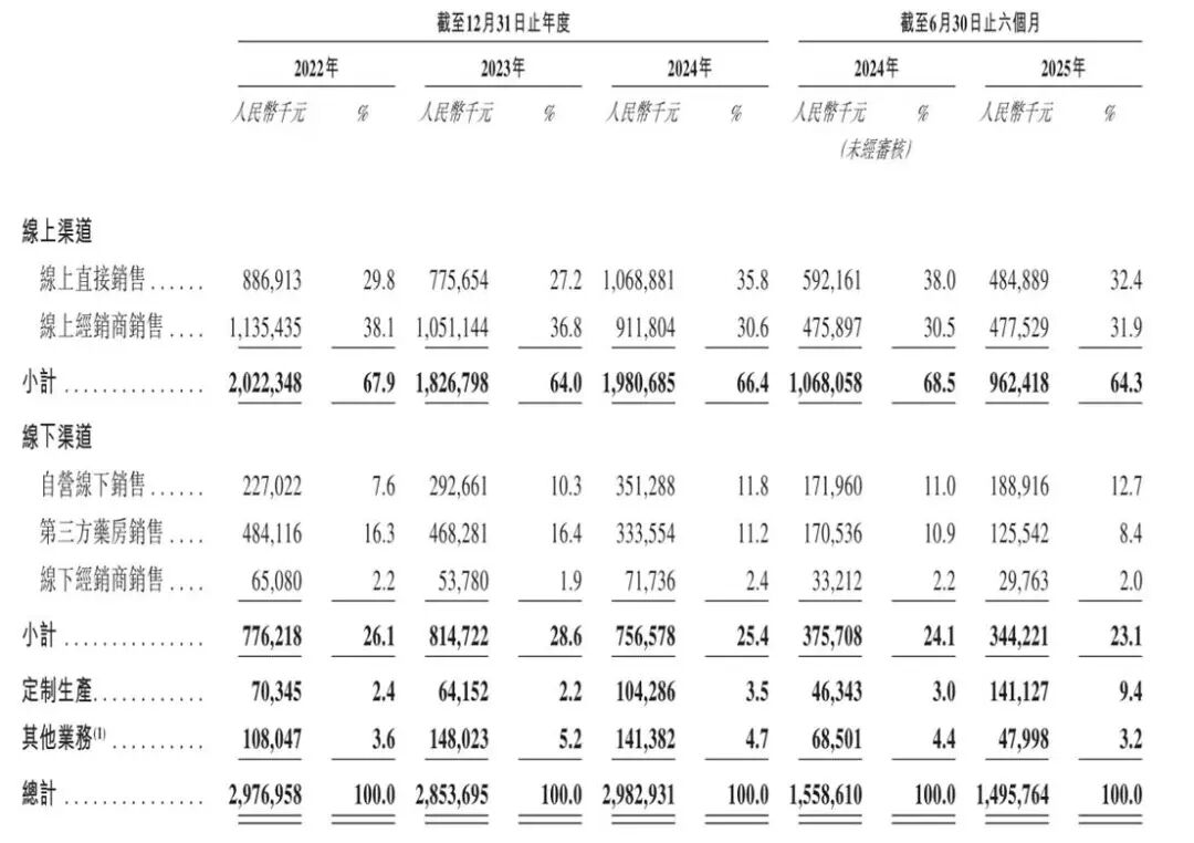 可孚醫(yī)療主要的銷售渠道為線上銷售,各期來自線上銷售的收入占比分別為67.9%、64.0%、66.4%及64.3%。