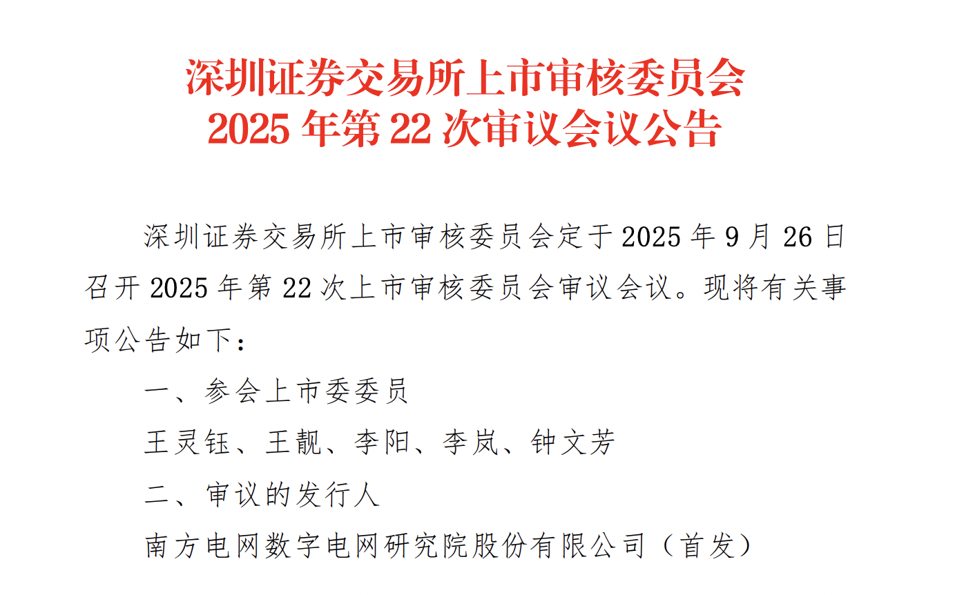 9月19日,據(jù)深交所公告,深交所上市審核委員會(huì)定于2025年9月26日召開2025年第22次上市審核委員會(huì)審議會(huì)議,屆時(shí)將審議南方電網(wǎng)數(shù)字電網(wǎng)研究院股份有限公司(以下簡稱:南網(wǎng)數(shù)字)的首發(fā)事項(xiàng)。