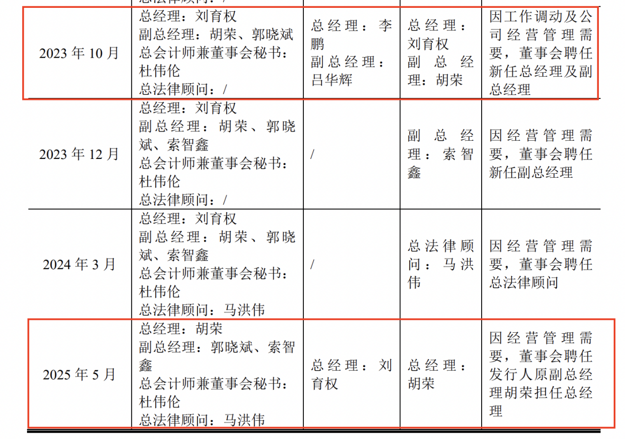 據(jù)瑞財(cái)社查閱,2023年10月,因工作調(diào)動(dòng)及公司經(jīng)營管理需要,董事會(huì)聘任新任總經(jīng)理劉育權(quán),原總經(jīng)理李鵬離職;2025年5月,因經(jīng)營管理需要,董事會(huì)聘任公司原副總經(jīng)理胡榮擔(dān)任總經(jīng)理,劉育權(quán)卸任總經(jīng)理一職。