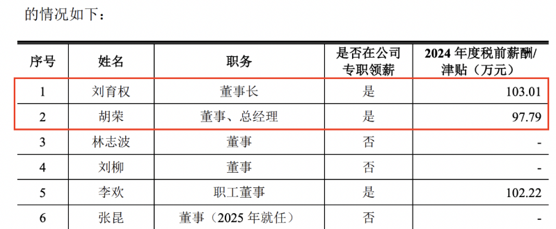 2024年,劉育權(quán)、胡榮薪酬分別為103.01萬元、97.79萬元。