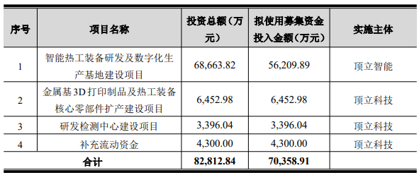 頂立科技此次IPO原計(jì)劃募資7.04億元,用于智能熱工裝備研發(fā)及數(shù)字化生產(chǎn)基地建設(shè)項(xiàng)目(5.62億元)、金屬基3D打印制品及熱工裝備核心零部件擴(kuò)產(chǎn)建設(shè)項(xiàng)目(6452.98萬元)、研發(fā)檢測(cè)中心建設(shè)項(xiàng)目(3396.04萬元)、補(bǔ)充流動(dòng)資金(4300萬元)。