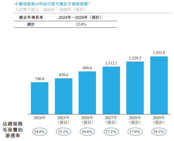 暖哇科技選擇此時遞交招股書,背后離不開保險行業(yè)數(shù)字化轉(zhuǎn)型帶來的市場機遇。據(jù)弗若斯特沙利文報告中預(yù)測,中國保險AI科技市場規(guī)模將從2024年的7468億元增長至2029年的1.35萬億元,年復(fù)合增長率達(dá)12.6%。