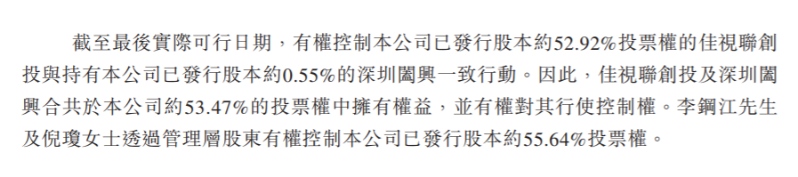 IPO前,李鋼江、倪瓊夫婦通過(guò)佳佳控股旗下的佳視聯(lián)私募控制的包括佳視聯(lián)創(chuàng)投等多家實(shí)體合計(jì)持股55.09%,深圳闔興持股0.55%,并與佳視聯(lián)創(chuàng)投一致行動(dòng)。控股股東合計(jì)持股55.64%。