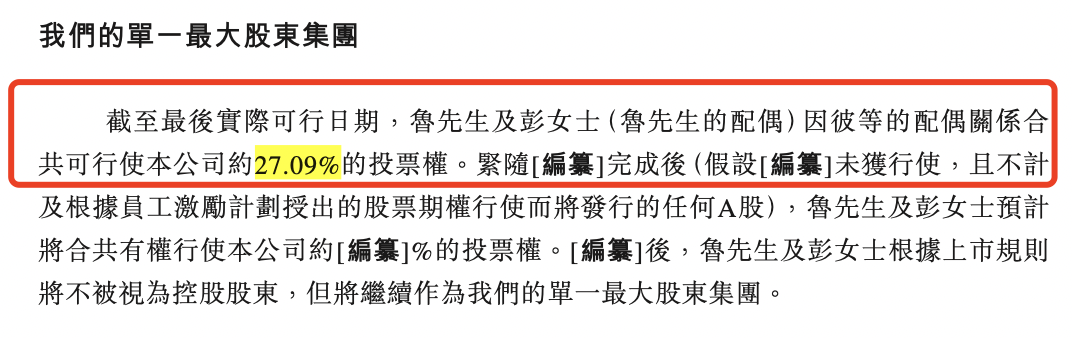 IPO前,魯楚平及彭惠因配偶關(guān)系合共可行使公司約27.09%的投票權(quán)。