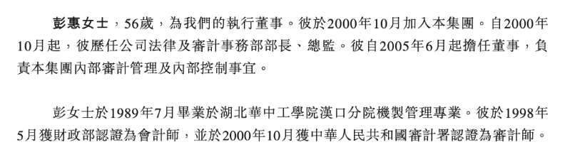彭惠,56歲,為公司執(zhí)行董事。其于2000年10月加入集團(tuán)。自2000年10月起,其歷任公司法律及審計(jì)事務(wù)部部長(zhǎng)、總監(jiān)。其自2005年6月起擔(dān)任董事,負(fù)責(zé)集團(tuán)內(nèi)部審計(jì)管理及內(nèi)部控制事宜。