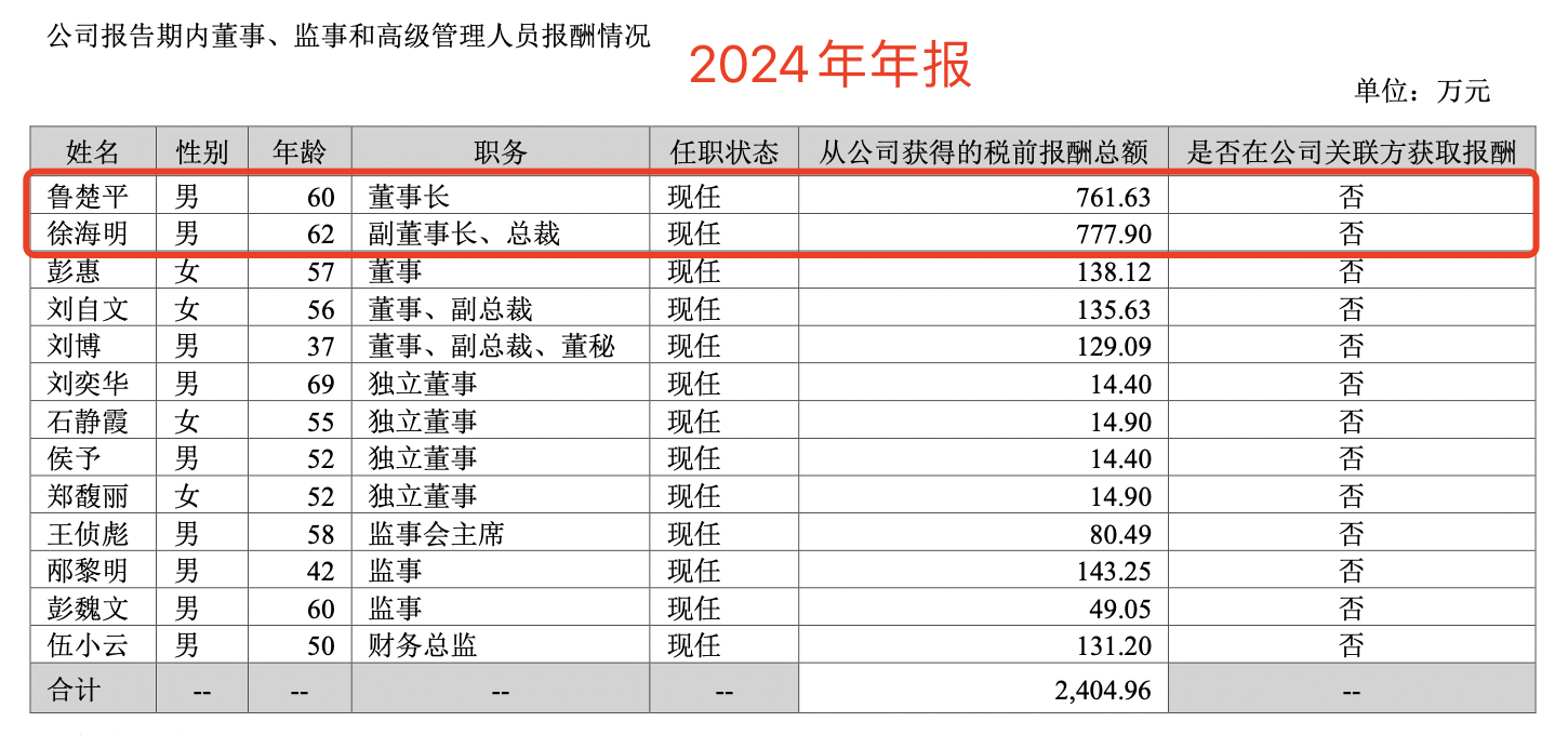 薪酬方面,2024年徐海明的年薪為777.9萬元,而魯楚平的年薪為761.63萬元,彭惠的年薪為138.12萬元。
