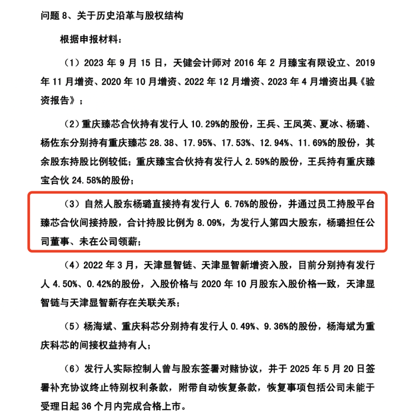 根據申報材料,自然人股東楊璐直接持有公司6.76%的股份,并通過員工持股平臺臻芯合伙間接持股,合計持股比例為8.09%,為公司第四大股東,楊璐擔任公司董事、未在公司領薪。