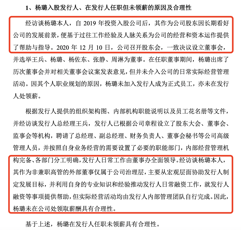 同時,楊璐作為非兼職高管的外部董事僅屬于公司治理層,主要從宏觀層面協(xié)助公司制定發(fā)展目標,并利用自身的專業(yè)知識和經驗推動公司日常融資工作,就公司融資等事項提供幫助,但實際經營活動均由公司內部管理團隊自行完成。因此,楊璐未在公司處領取薪酬具有合理性。