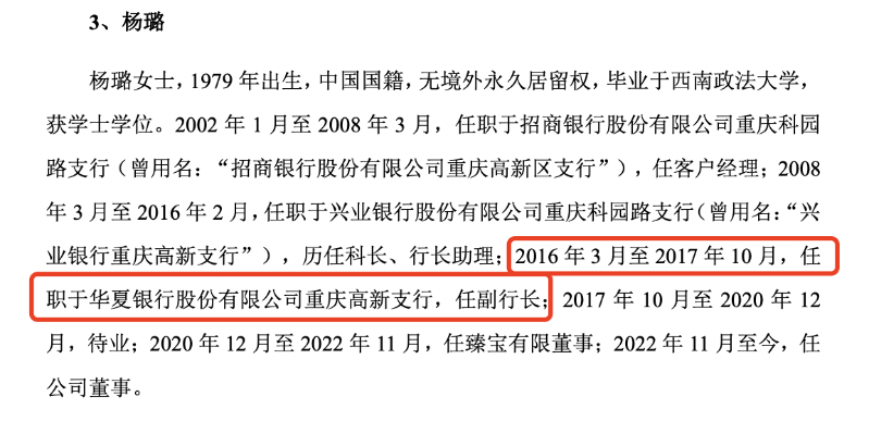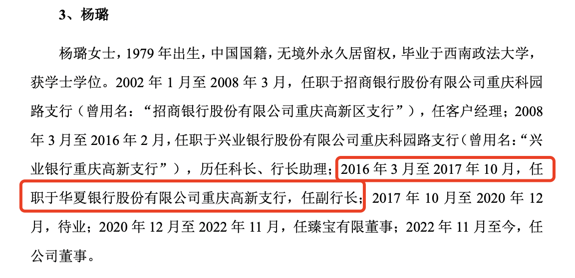 資料顯示,楊璐,女,1979年出生,中國國籍,無境外永久居留權,畢業(yè)于西南政法大學,獲學士學位。2002年1月至2008年3月,任職于招商銀行股份有限公司重慶科園路支行(曾用名:“招商銀行股份有限公司重慶高新區(qū)支行”),任客戶經理;2008年3月至2016年2月,任職于興業(yè)銀行股份有限公司重慶科園路支行(曾用名:“興業(yè)銀行重慶高新支行”),歷任科長、行長助理;2016年3月至2017年10月,任職于華夏銀行股份有限公司重慶高新支行,任副行長;2017年10月至2020年12月,待業(yè);2020年12月至2022年11月,任臻寶有限董事;2022年11月至今,任公司董事。