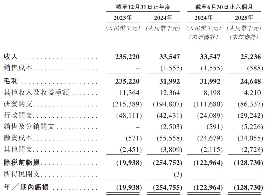 于往績記錄期間,公司收入主要來自對外許可收入及醫(yī)藥產(chǎn)品銷售。截至2023年、2024年12月31日止年度及2025年6月30日止六個月,公司分別產(chǎn)生虧損約1.99億元、2.55億元及1.29億元,主要由于持續(xù)的研發(fā)投入。