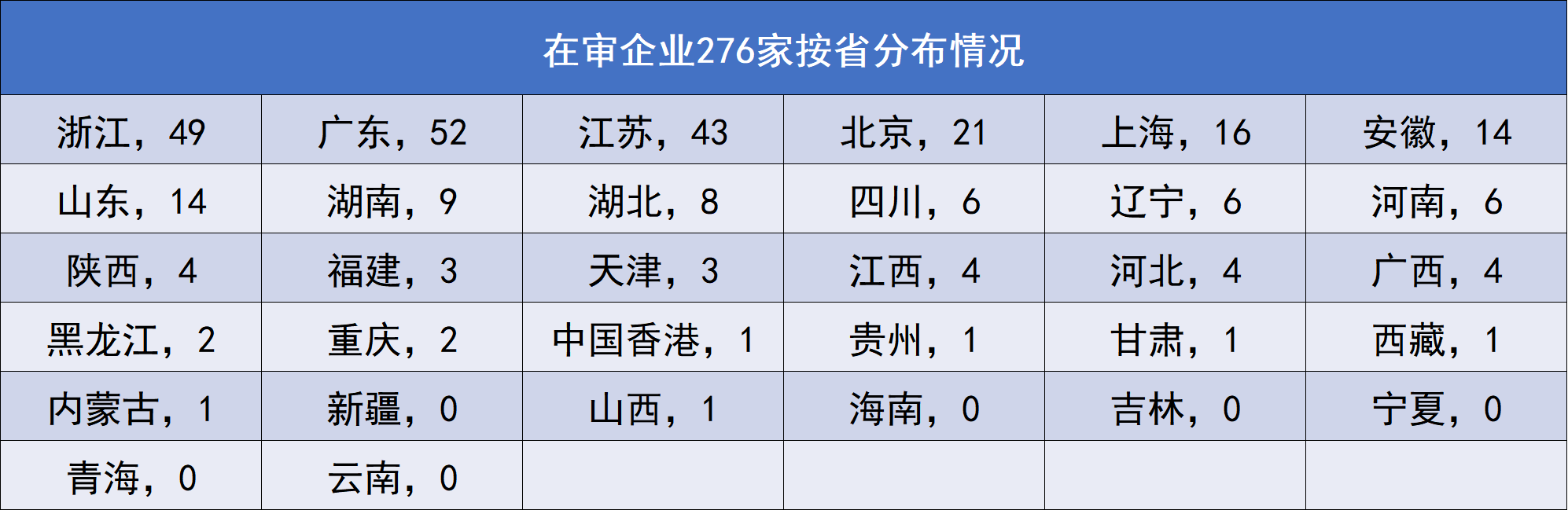 276家在審企業(yè)按省市區(qū)分布情況看,浙江49家,廣東52家,江蘇43家,北京21家,上海16家,安徽14家,山東14家,湖南9家,湖北8家,四川6家,遼寧6家,河南6家,陜西4家,江西4家,河北4家,廣西4家,福建3家,天津3家,黑龍江2家,重慶2家,中國香港1家,貴州1家,甘肅1家,西藏1家,內蒙古1家。