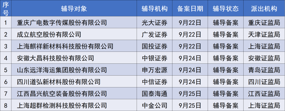 本周,啟動輔導備案的企業(yè)共8家,分別是重慶廣電數(shù)字傳媒股份有限公司、天津成立航空股份有限公司、上海麒祥新材料科技股份有限公司、安徽大昌科技股份有限公司、山東遠洋海運集團股份有限公司、四川道弘新材料股份有限公司、江西昌興航空裝備股份有限公司、上海超群檢測科技股份有限公司。