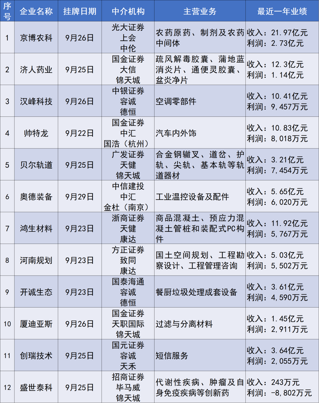 11家企業(yè)掛牌新三板截至9月26日,全周掛牌新三板的企業(yè)共11家,分別是京博農科、濟人藥業(yè)、漢峰科技、帥特龍、貝爾軌道、鴻生材料、河南規(guī)劃、開誠生態(tài)、廈迪亞斯、創(chuàng)瑞技術、盛世泰科。