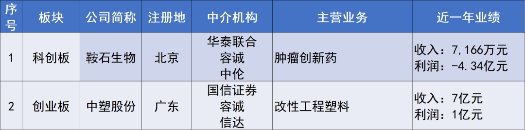 全周新增申報的企業(yè)2家,其中,科創(chuàng)板1家,為鞍石生物,創(chuàng)業(yè)板1家,為中塑股份。