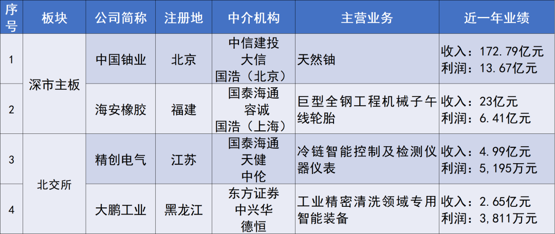 當周通過注冊的企業(yè)4家,其中,深市主板2家,分別為中國鈾業(yè)、海安橡膠;北交所2家,分別為精創(chuàng)電氣、大鵬工業(yè)。