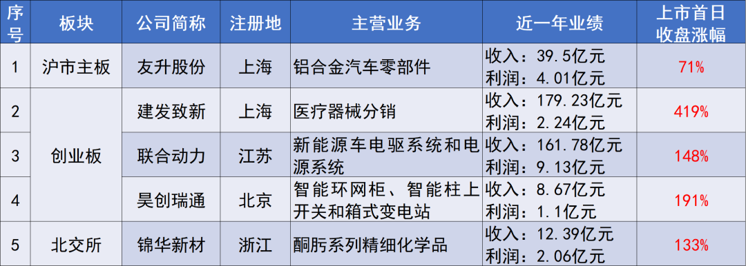 當周掛牌上市的企業(yè)5家,其中,滬市主板1家,為友升股份;創(chuàng)業(yè)板3家,分別為建發(fā)致新、聯(lián)合動力、吳創(chuàng)瑞通;北交所1家,為錦華新材。